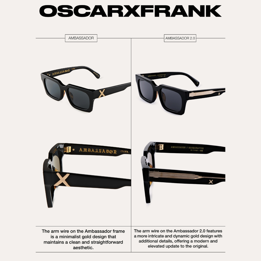 The AMBASSADOR is a brand new SS/24 style to the OXF range, a unisex frame designed to suit all occasions. Featuring our trademark oversized 24k gold X logo. The Ambassador has been created 100% in-house within the Oscar & Frank Design Lab.
